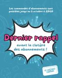 Les commandes pour "le cartable ludique" se terminent ! Si vous souhaitez abonner votre enfant, vous avez jusqu'au 5 octobre pour le faire ! N'hésitez pas !! Les abonnements commencent à partir du CP, vous recevrez les jeux directement à l'école.